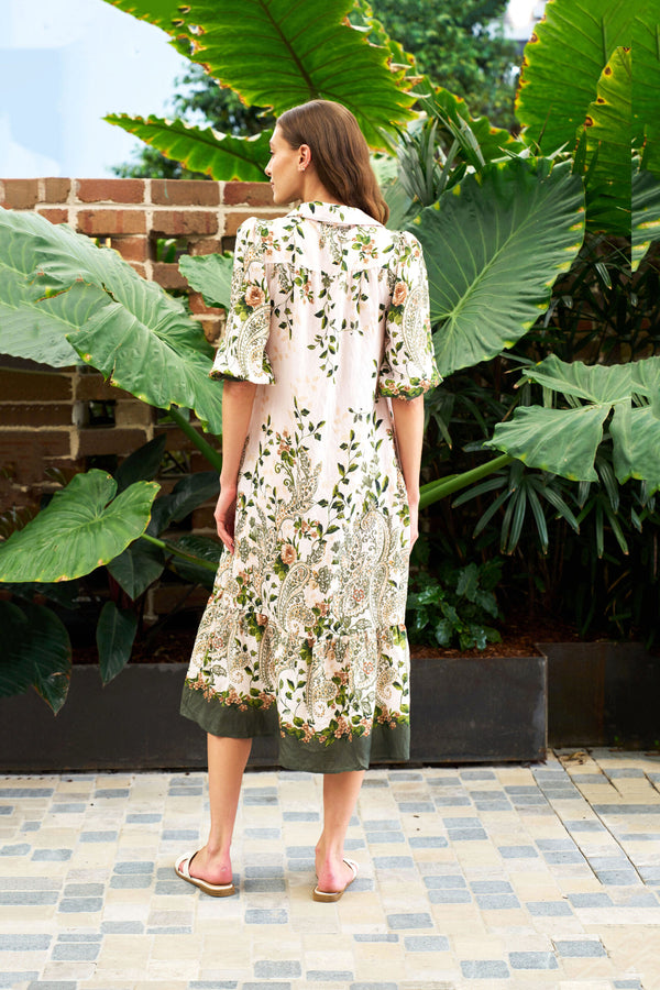 Billowing elbow-length sleeves add a soft touch of drama, while the tiered hemline moves gracefully with every step. The blend of cream and deep green tones evokes nature’s calm — the perfect balance of elegance and ease.