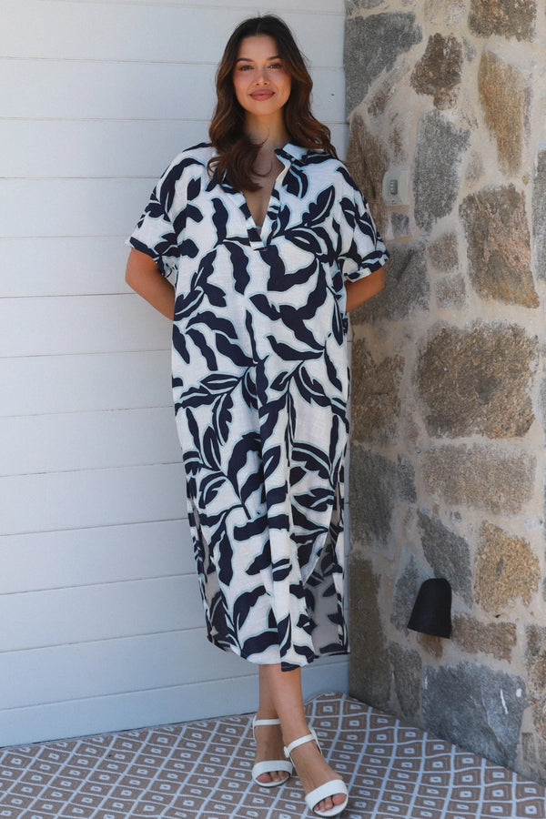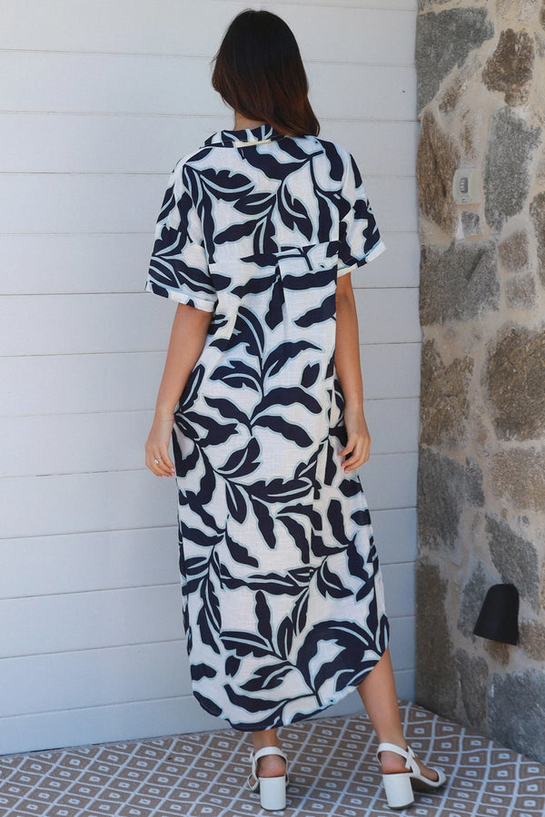 Designed with convenience in mind, it includes functional side pockets and a roomy, free-flowing shape that flatters all body types. The bold navy with light blue leaf print brings a fresh, nature-inspired feel—perfect for sunny days, weekend outings, beach trips, or casual lunches.