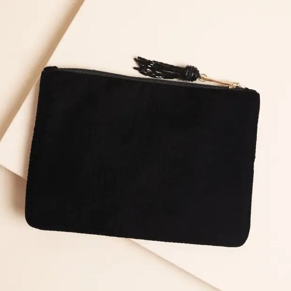 Made of rich black velvet, the pouch features a detailed embroidered bee with white sequin wings, gold beads, and black bead accents for a luxurious finish.