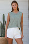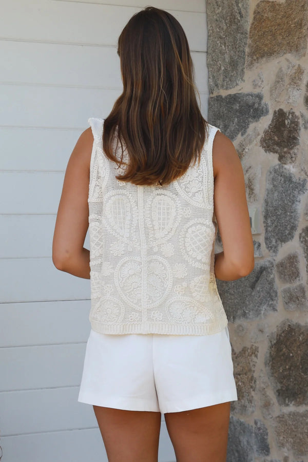 Featuring a soft sleeveless cut and delicate scalloped edges, this piece feels both relaxed and refined. The button-front design allows you to wear it open over a cami or buttoned for a classic, structured look. Made from breathable fabric, it’s perfect for sunny days, weekend outings, or layering over linen pants and shorts.