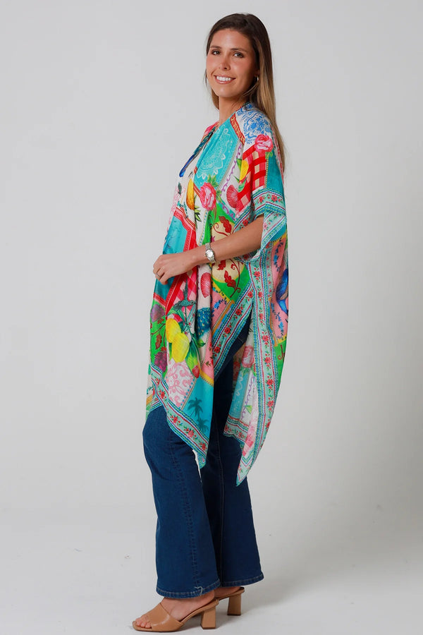 A lovely viscose light weight cape that's perfect as a coverup for a swimsuit on a day out at the beach or a great layering piece for your pair of shorts or pants.