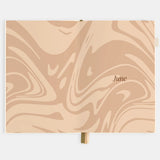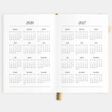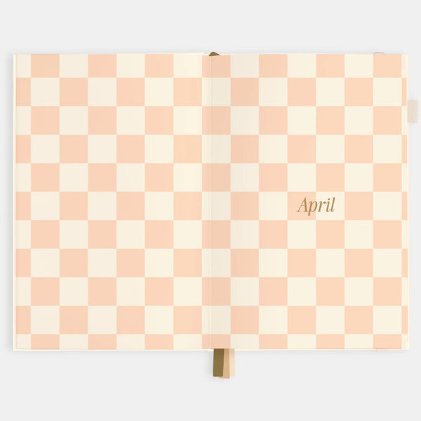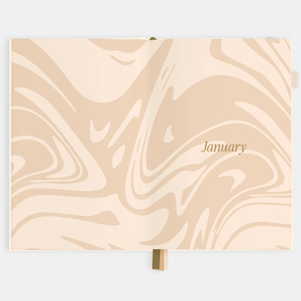 208 pages. One week per spread and monthly spreads at the beginning of each section. Gold foil stamped linen cover with gold foil edging. Three grosgrain ribbons in rust, blush and cream.